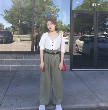 整体的颜色搭配就给人一种很清爽的味道了,简直宛若一朵盛开的白莲啊。上衣采用了泡泡袖的设计,毫无痕迹的遮挡住了手臂的肉肉,宽大的v领性感迷人,也特别凸显锁骨,露出脖线和锁骨,也会给人一种迷人身材的错觉,使整个人看上去瘦了三个度!宽松的阔腿裤非常的清凉,夏天穿绝对不会闷热哦,腰带的地方是一整套搭配亮点。