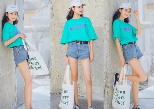 这么热的天气,清新的单品都是比较受欢迎的,这款上衣是绿色T恤,看着就很清新干爽的哦,上身特凉快的,搭配一件A字牛仔短裤这样搭也是最经典,最CP的,夏天在街上随便一拍都能捕捉到这样的穿搭,偏爱简约穿法的女生,选择这样穿就可以了,时尚又显气质,很潮很好看!