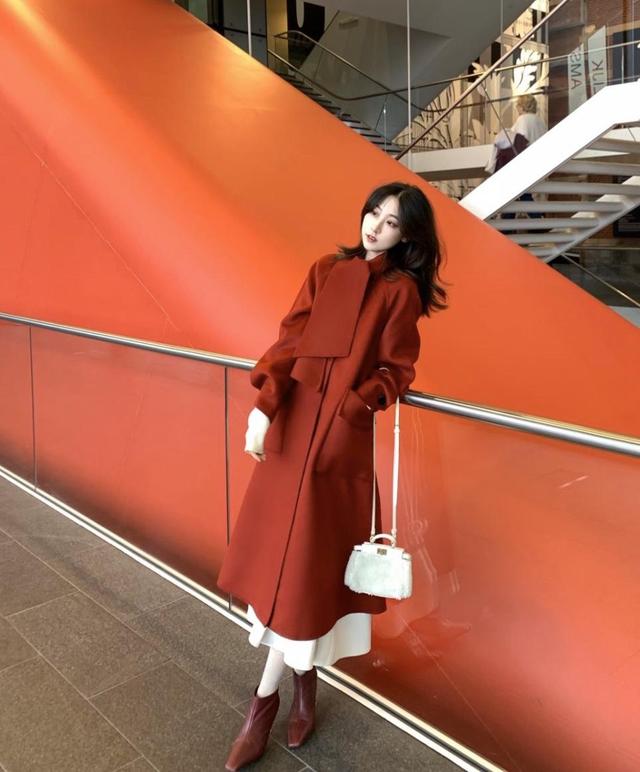 长款样式的红色呢子大衣搭配裙装更适合呈现淑女风范,在行动时,裙摆在衣缝间不经意的摇曳,更能够增添美感。半身裙不挑腿型,更容易展现出女性柔美的一面,搭配低马尾更显温婉与柔和的气质。