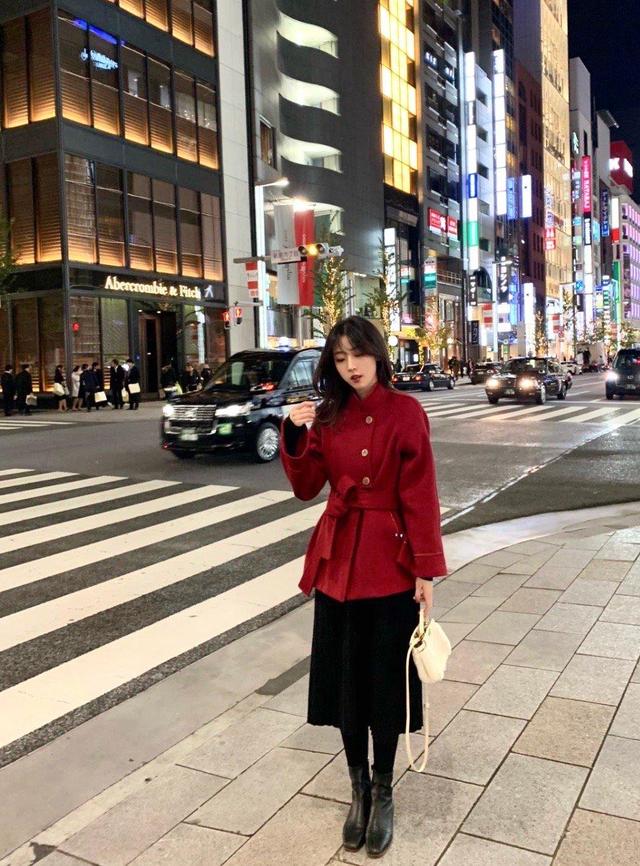 若是这个冬天也想要展现s型的柔美身材曲线,那就需要一款系带的毛呢大衣。图中时尚博主选择这款红色的大衣,就采用的是宽大的腰带设计,轻巧的系一个蝴蝶结,不仅能够勾勒出明显的腰身,还能够起到点缀的作用,为整个人增加一丝甜美的意蕴。