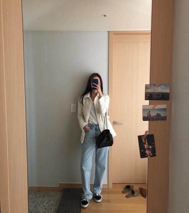 像宽松的牛仔裤也十分的适合春天,一款衬衣领的外套,多了一种休闲感,当然了,这样穿在身上,也很舒适的。搭配一款黑色的包包,随性又好看。
