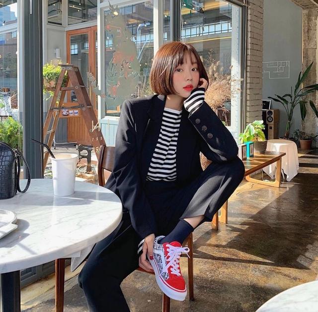 红色的帆布鞋,还能提亮你的整体风格。小西装的外套,不仅适合职场上穿,还适合日常的穿搭。这种红色的帆布鞋添加了手绘的元素,看上去很有特色。