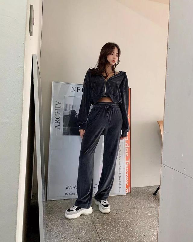 这种丝绒款式的服装,也是极为的适合春天的。看上去很有质感,穿在身上能提升你的自信,让你更具有魅力。在春天里,当你不知道选择什么样的衣服时,不妨试试这种,跟运动鞋搭配在一起,只要你出街都能让你回头率超高。