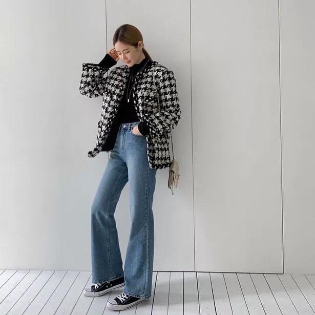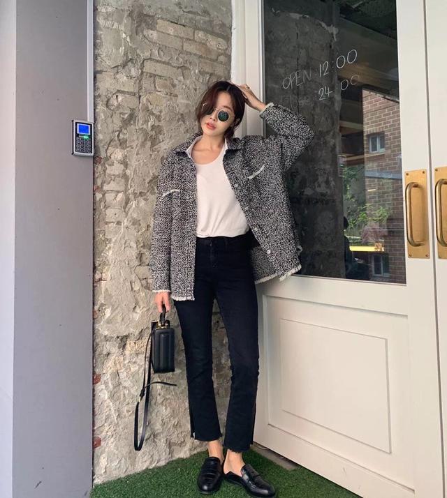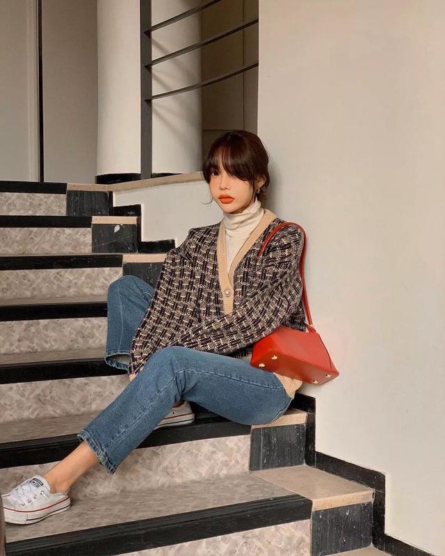 譬如跟牛仔裤搭配也是极好的,还多了一点休闲感。尤其是还搭配了一双帆布鞋,运动的气息就这样散发出来了。虽然说小香风的外套自带名媛的气质,但是呢,跟比较休闲的风格去搭配,说不定还会颠覆你对小香风的认识。