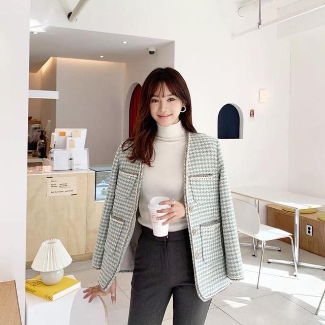 其实,小香风除了黑白色,还有这种浅绿色系的,搭配一款黑色的西装裤,就能看出你是职场中的白领。这样款式的风格,就不建议你日常去穿了,毕竟,这种及腰的西装裤子更适合职场一点,日常去穿的话,多多少少会有点不妥。如果你是搭配的直筒裤,或者是牛仔裤,那肯定就更适合了呀。