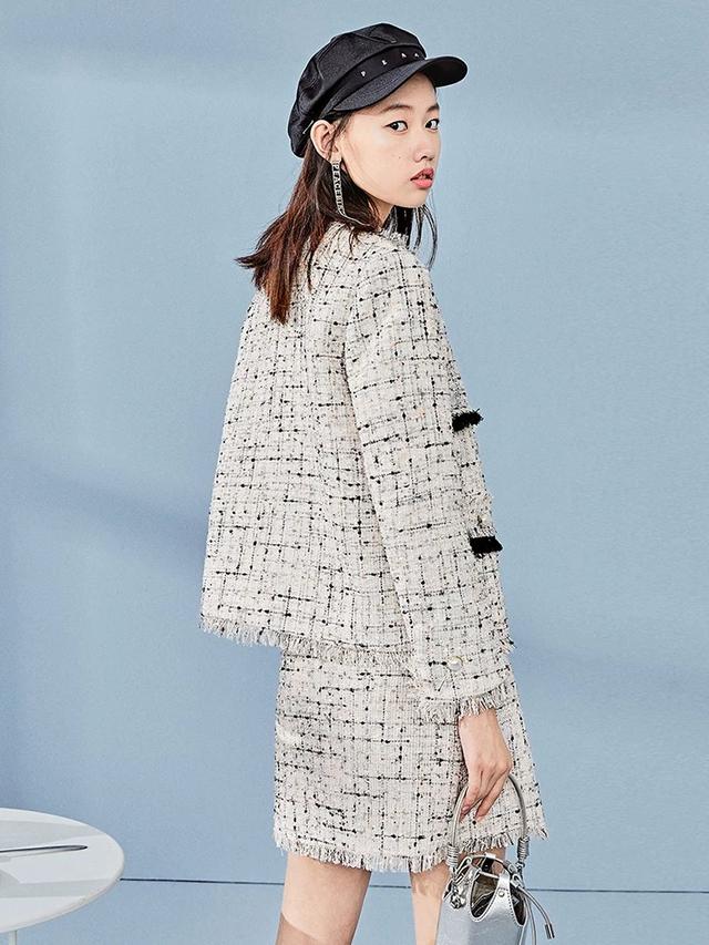 素白色的小香风,也是非常的知性,穿在身上简直太有气质了,袖筒配上流苏的款式,增加了整体服装的特色,这样看上去感觉自己就像名媛一样呀。除此之外,你还可以搭配一款同色系的包包,这样还能撑起你的气场,当然了,你在聚会的时候,披着穿也能吸引更多人的目光。