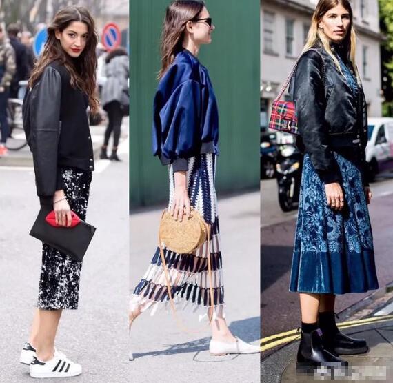飞行员与半身裙或连衣裙的混搭,既有女性的温柔气质,也有很休闲的感觉。黑色机车外套搭配黑灰色亮片半身裙,再踩上一双简单的小白鞋,用一抹红唇来作为全身的亮色,整体搭配超有女神范。若是把鞋子换成黑色靴子也超好看,搭配屋。整体搭配显得更有层次感了。