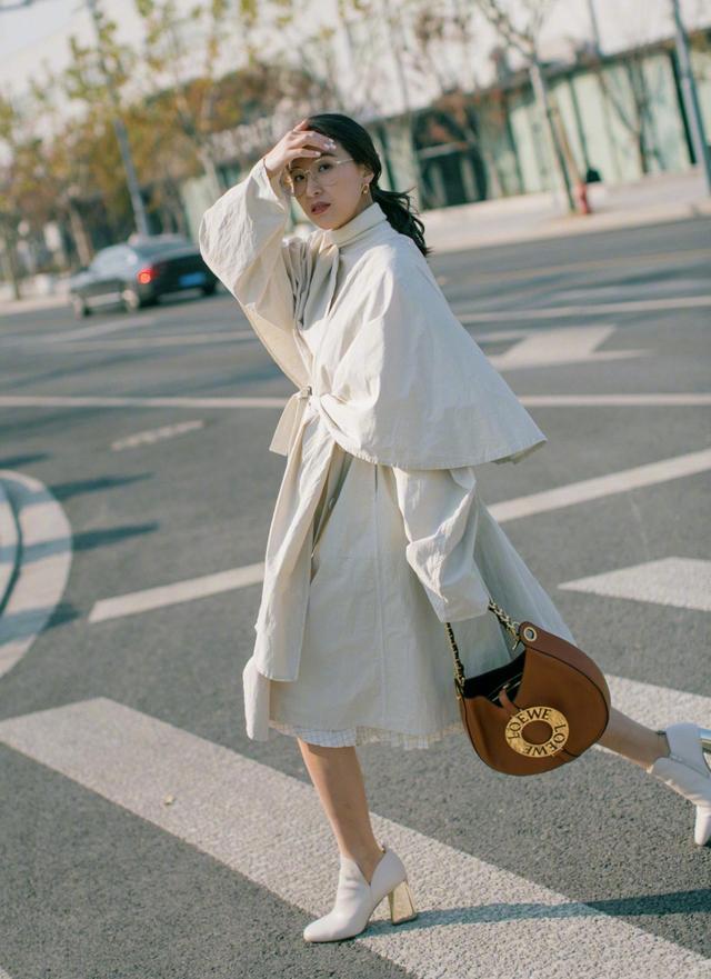 因为这款斗篷式的风衣加入了腰间的系带,所以可以打造出连衣裙一样的穿着效果。如果在下半身搭配同样是白色的半身裙,那么优雅的气质会更加明显。穿上这款风衣,可以搭配低马尾,女装搭配。将视觉重心下移。即使是不经意间的一个侧脸,也能够尽显女人的温婉好气质。