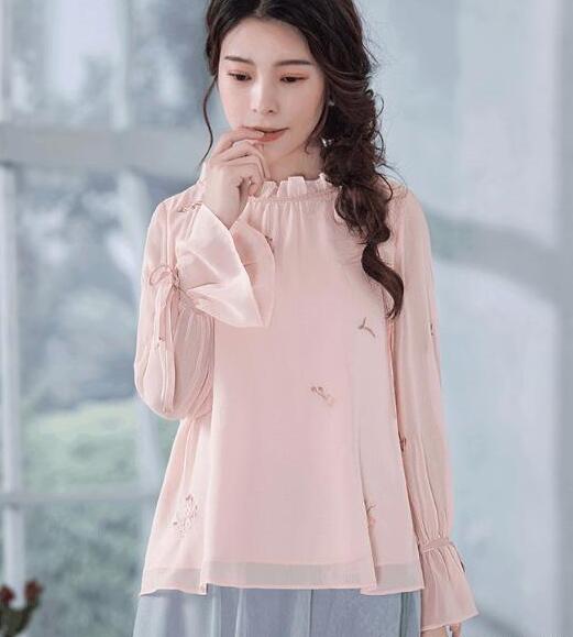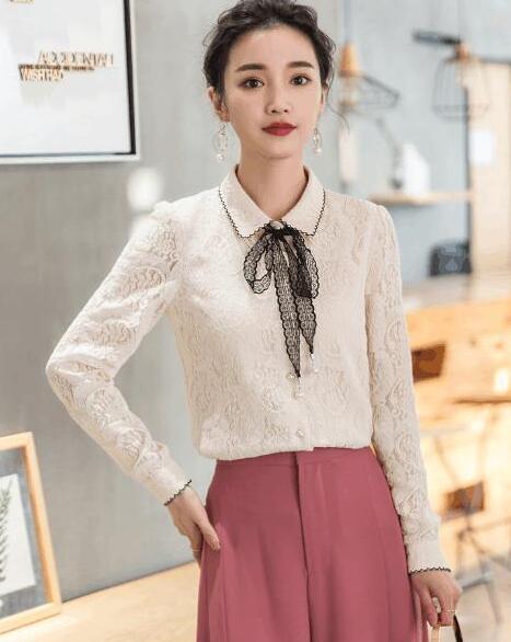 精致的娃娃领设计,优雅时尚不俗套,穿上后让你更显年轻。搭配藕粉阔腿裤,瞬间让你重回少女时代,粉粉嫩嫩很有女人魅力。OL办公室美女们,这样的装扮让你更显精神,工作起事半功倍哦。