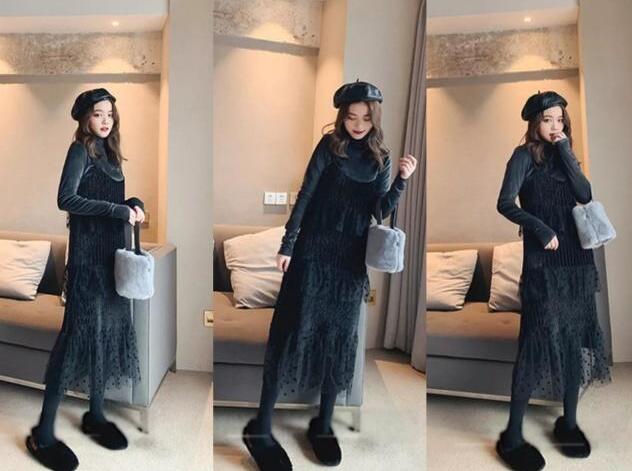 吊带设计的黑色连衣裙,看起来就特别地优雅时尚的了,比较宽松的版型,所以穿起来显瘦的效果就不用多说,内搭的黑色打底衫,又可以增加你造型的优雅feel,裙摆做了蛋糕式的设计,行走间那般唯美又灵感的感觉,超美的哦,冬天内搭一条灰色打底袜,脚踏双黑色的毛毛鞋子,超级暖和。