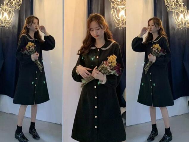 这款黑色连衣裙,A字的裙型,配上单排纽扣的设计,不挑身材,谁穿谁好看,还特显瘦的,而领口做了娃娃领的设计,更添你造型的甜美feel,很有少女的味道,超显气质的,比较百搭的一款,搭配黑色鞋子,更显优雅迷人气质。