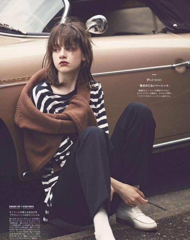 黑白条纹的设计就是黑色和白色的经典颜色搭配,条纹时尚感十足又显得人很青春有活力。搭配一条黑色的裤子和白色的皮鞋,让人觉得韩范十足,是很酷帅的感觉。此时为了增加穿搭时候的时尚感觉,选择了一件棕色的上衣作为装饰。