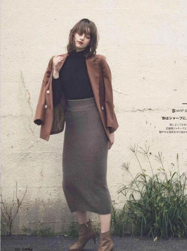 这一套给人的感觉是淑女中又带着帅气,淑女是针织裙、高跟鞋以及针织毛衣带来的感觉,这些单品搭配在一起,给人一种看起来就很舒服有气质的感觉。而外套的设计是棕色的皮质上衣,让人感觉顿时帅气不少。这一套搭配起来不会让人觉得很有攻击性,不过却用简单的单品塑造出了相当有气场的风格。