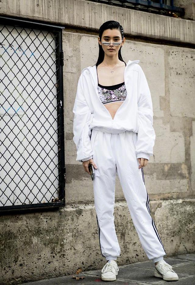 薄款的卫裤不容易显腿胖,在搭配上装时,也不用刻意避开宽松的版型来协调上下装搭配,反而可以直接选择穿套装,简单方便又实穿,还不会出错。像奚梦瑶这一身造型就选择了套装式的外套+卫裤,短款上衣加高腰卫裤的搭配能突出身材比例,再加上抢眼的亮片吊带内搭,街头感十足。