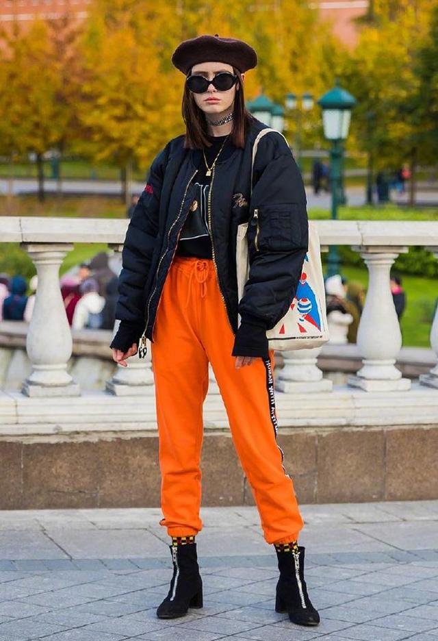 有一部分女生会把卫裤穿土,大多数是因为颜色搭配上出了错。打个比方,比如你穿了一件颜色对比很强烈的卫裤,在挑选上装时,就尽量避开亮色系的服饰单品,避免整个造型没有重点、视觉上过于眼花缭乱。像下图这一身造型的颜色对比就太冲突了,瞬间变非主流……