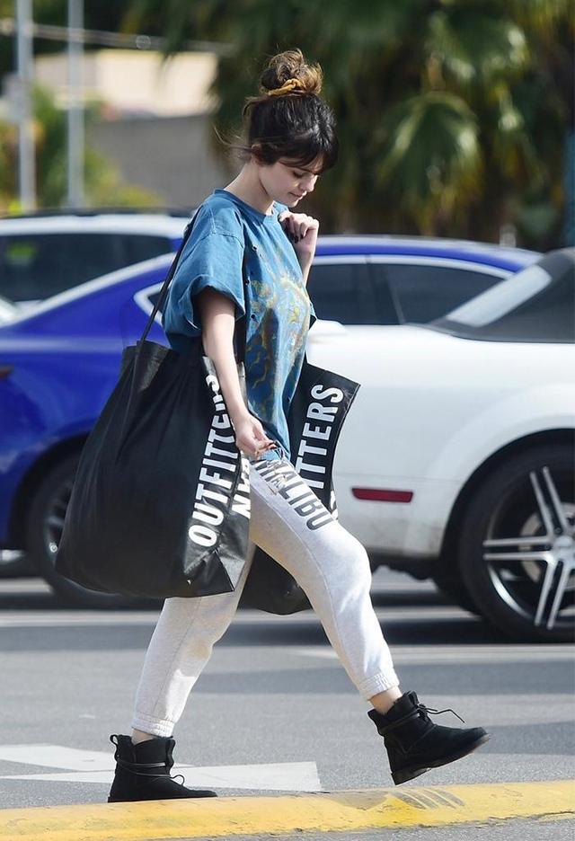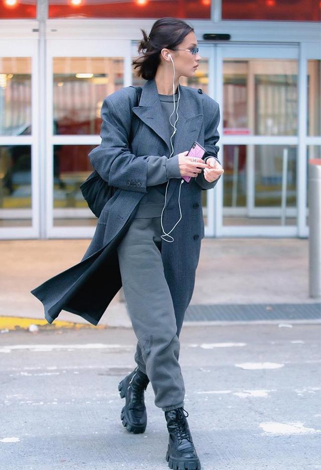 除此之外,束脚的卫裤在搭配鞋子时也更加多元化,像比较日常的运动鞋和帆布鞋根本不在话下,还可以选择高帮的马丁靴或者短靴来凸显造型,束口的设计能将裤脚塞进鞋子中,即便搭配普通的T恤或者外套也能秒变时尚达人。像Bella穿卫裤时就搭配了一双黑色小皮靴,灰与黑的结合更显酷雅气息。