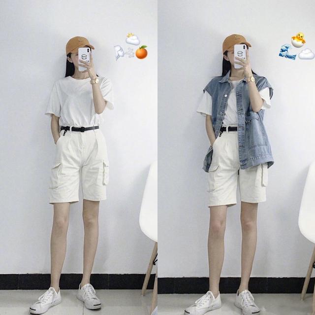 白T恤搭配牛仔短裤,看上去清爽又舒适。白T恤的款式也有很多,不同的领型,对身材都有修饰的作用,选择大v领,绝对错不了。