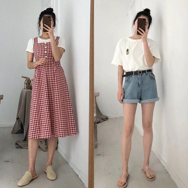 小个子女人日常穿T恤,除了把上衣塞到裤子里。还有一种更为显高的方式,搭配连体裤或者是抹胸裙,也能穿出显高的视觉感。