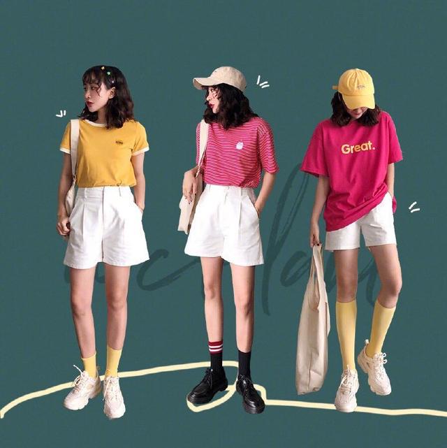 彩色的T恤相信每一个女人的衣柜里都会有个一两件,彩色的T恤在搭配的时候,为了避免色彩的冲撞感,用一条白色的短裤相搭配,就不容易出错。