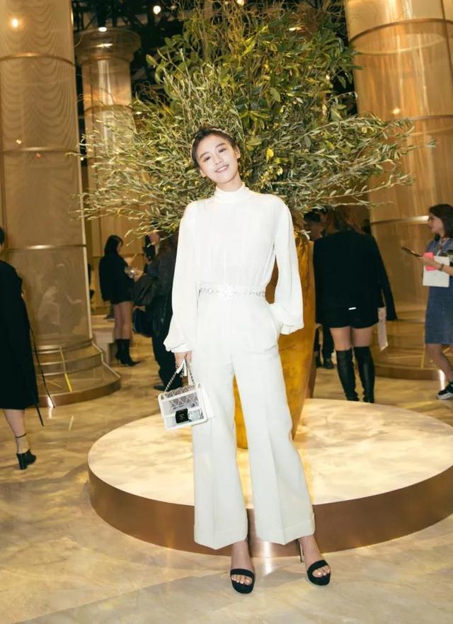 一身白色搭配显得清爽又干净,整体看起来十分利索得体,配上黑色的高跟鞋显得精致满满。白色的立领喇叭袖上衣衬衫显得整个人干练起来,腰间系上镶钻镂空的花腰带为整体增添细节感,显得精致又高级,搭配上白色的阔腿裤,很好地将腿部曲线的不足之处埋藏在裤子之下。挎上透明的白色pvc单肩包,显得时尚感满满。