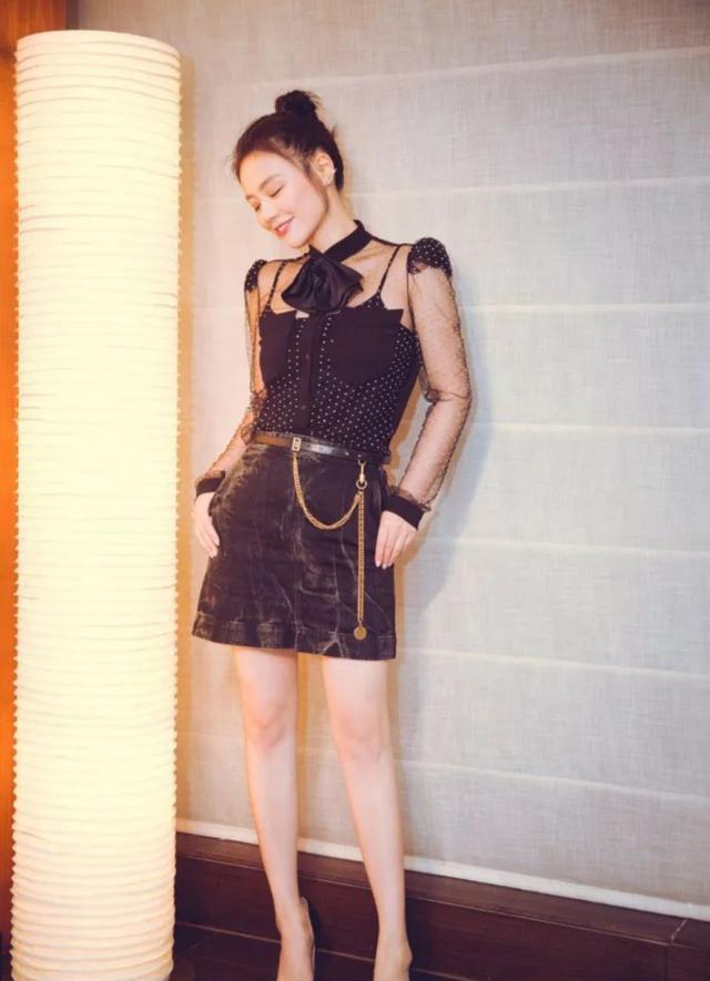 马思纯是很了解自己的身材优势的,你看她机智地利用了透明的蕾丝将自己纤瘦的脖颈漏出来,再利用黑色的系带蝴蝶结拉长脖子的曲线显得,整个人气质满满,也是很显瘦的技巧。再加上高腰线的短裙设计显得整个人腿又长。