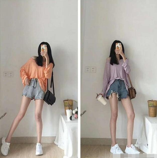 在基础款牛仔短裤的裤脚上加入了吸睛力十足的破洞以及毛边等设计,女装搭配。营造出不规则的版型,而且裤脚上因为设计而漏出的一部分肌肤能起到很好的露肤效果,让整体的风格更加时髦。