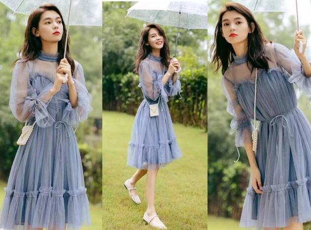 大地回春的春天,没有一条网纱连衣裙哪能行呢,这款网纱连衣裙,一眼就可以吸引人的眼球,拼接灰蓝色的网纱质地,仿佛把少女般的梦境穿上身,仙气感满分,超美腻的,领口、胸前、背后、裙摆都是木耳皱褶花边的点缀,为裙子增添俏皮甜美feel,还超个性潮流的,半透视的蓬蓬裙,更加人的幻想感和梦幻少女感,腰间若隐若现的同色系腰绳,修饰身材的同时,又展示出最美好的你,2019年春季穿上这款妹妹的连衣裙,日常都能有甜蜜的心情,怎么穿都美。