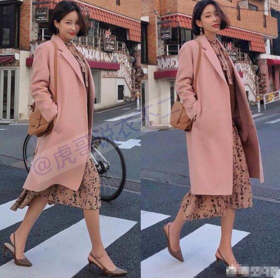 风衣和大衣是秋冬季节必备的外套,而且也非常的百搭,最重要的是提升气质,粉红色的毛呢大衣内搭咖啡色碎花连衣裙,时尚又透着高级范,粉色的大衣非常的衬托肤色哦,不管多大年纪,也要保持一颗少女心哪!