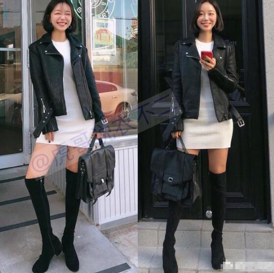 白色的针织包臀裙搭配黑色皮质短夹克,性感又帅气,至于搭配的长靴,可以根据你的腿长来选择靴子的长度!