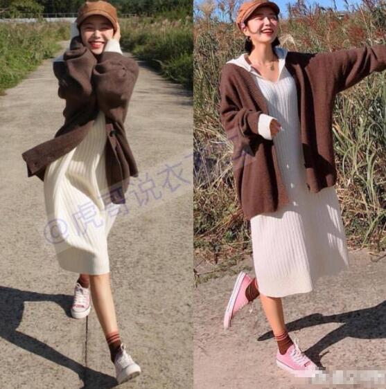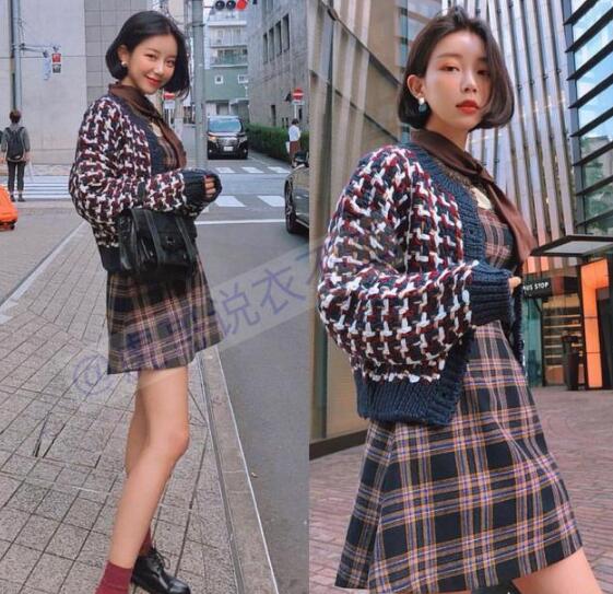 连衣短裙搭配针织开衫,开衫可以选择纯色,也可以选择带提花图案的款式,虽说两者的视觉冲击都比较大,但是搭配一条深咖色的领结就能解决问题,细节决定成败哦!