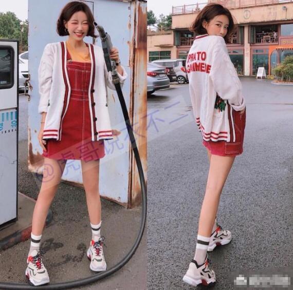 要想搭配减龄,怎么能少得了背带裙,这种自带可爱俏皮的时尚单品怎么穿怎么年轻,红色的牛仔背带裙搭配温柔的白色针织开衫,气质温柔又淑女。