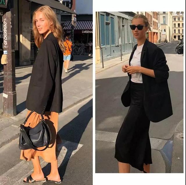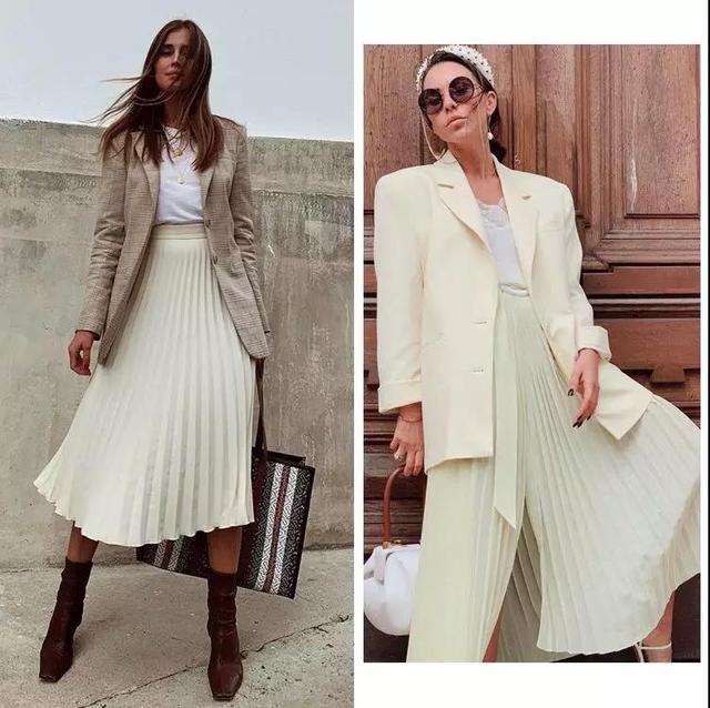 半身裙穿搭不管在哪个季节都应该被宠爱,因为实在是太能凸显女人味了。图中的着两款黑西装都是宽松的版型,有点男士款的干练气息,但是一旦搭配上半身裙就会流露出满满的柔美气息。左图这种土棕色很有秋冬的感觉,搭配拖鞋休闲又慵懒。
