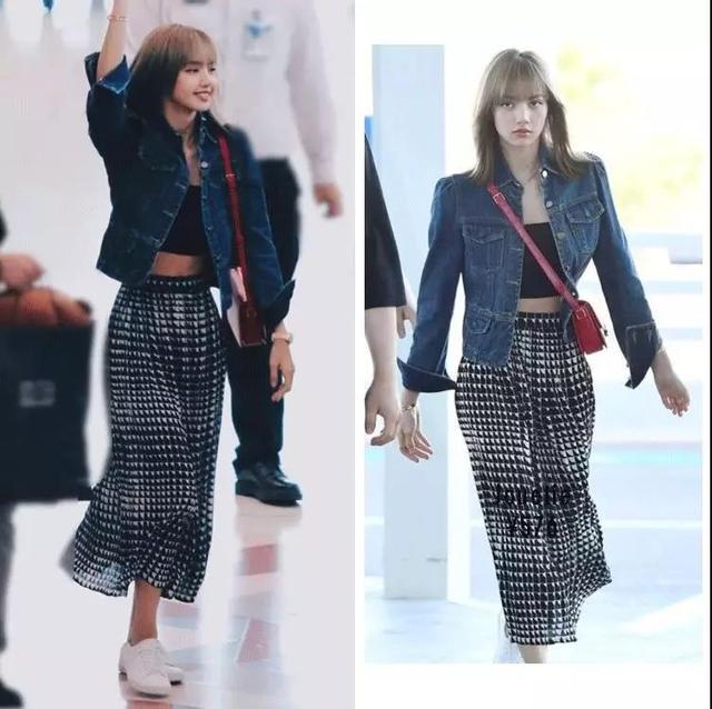 Lisa的身材真的太可了!这种垫肩款牛仔外套在普通人身上就是灾难现场,好在lisa够瘦才不会显得臃肿。内搭黑色裹胸,性感与活力兼具。低腰款黑白格子裙灵动又轻盈,就算是秋装也要美成仙。最抢眼的莫过于她的小蛮腰和大长腿啦。