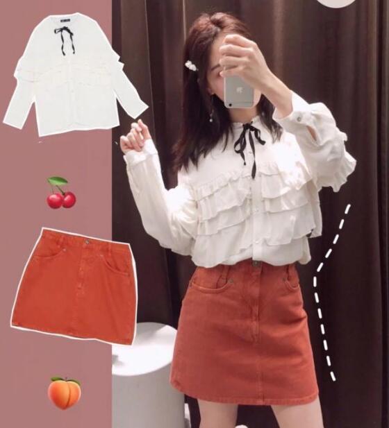 乍一看,你不禁想模仿它。充满感觉的白色衬衫拼接,比基本款更时尚。搭配牛仔裙,它的年龄和外观都很好。白色衬衫上的荷叶边和蝴蝶结使其更加甜美和女性化。一个矮小的女孩穿着正确。