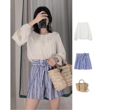 超级度假风的一套搭配,及休闲舒适和时尚于一身,上衣是轻薄的雪纺材质,胸口和袖子上面都做了镂空的设计,不仅增加的美观度,而且也会比较凉爽,衣服是单层的,所以会稍稍有点透,怕走光的女生里面可以穿一件白色的抹胸哦。蓝色的高腰绑带短裤是棉麻的材质,特别舒服,有一点中性风,穿上身之后会有一种大女人的感觉哦。