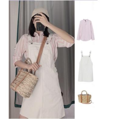 超级清秀的一套,这件粉白色条纹衬衫如果是单独放出来的话一定有很多的女生都不会喜欢的,但是经过背带裙的搭配,整体的感觉就变得马上不一样了,特别乖巧的学生妹气息,而且粉色和白色在一起真的是超级显温柔,整体宽松的搭配完全不挑身材哦,胖瘦皆宜的一身,但是身材比较瘦小的女生还是建议选择小一点的尺码哦,这样看上去才会比较有活泼的感觉。比较有肉感的女生就可以选择相对宽松一点的码数了。