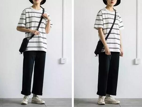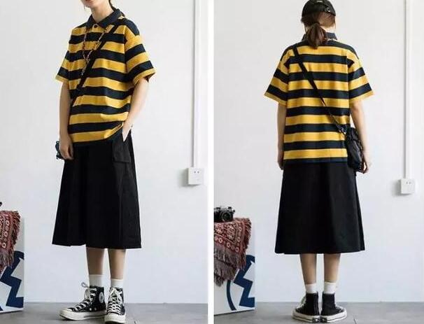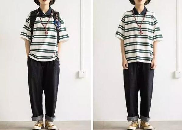 今年中性风的穿搭出境率也是相当高啊,女生如何穿出一番假小子的味道?只要穿得够大,够潮流就行,虽然T恤是夏季的标配,但是少不了一件凹造型的polo衫,条纹的元素,青春活力的象征,搭配下装一条宽大的阔腿裤,包容着各种特点的身材,不但能提高辨识度,而且超级潮流,超级酷的~