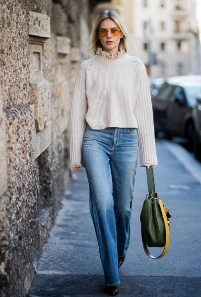 秋冬pick牛仔阔腿裤,休闲又带着个性感。上半身get浅色毛衣,优雅又甜美。它的短款设计,拉长了小仙女的腿长比例,彰显高挑气质范。领口的荷叶边,更是彰显着满满的少女感。手提绿色的包包,清新又活泼,非常吸睛。
