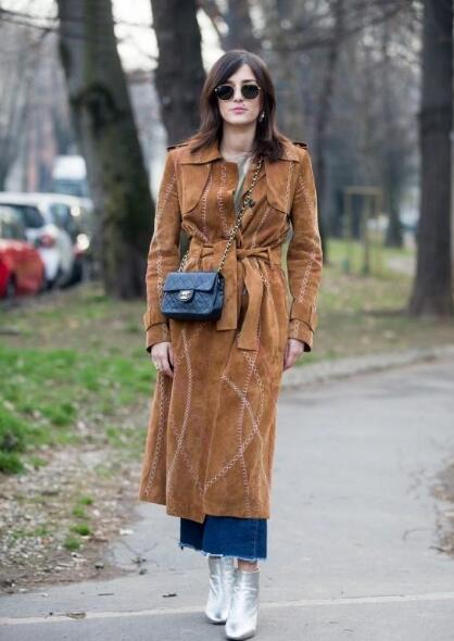 棕色长款外套,凸显着知性感。在腰间系上腰带,凸显了小仙女纤细的腰肢。搭上蓝色阔腿裤,优雅又大方,温暖又休闲。显得颜色上的层次感特别强。脚上pick的是银色短靴。吸睛又显高挑,气场满满。斜跨一个链条包,给小仙女的增加了一些活泼感。