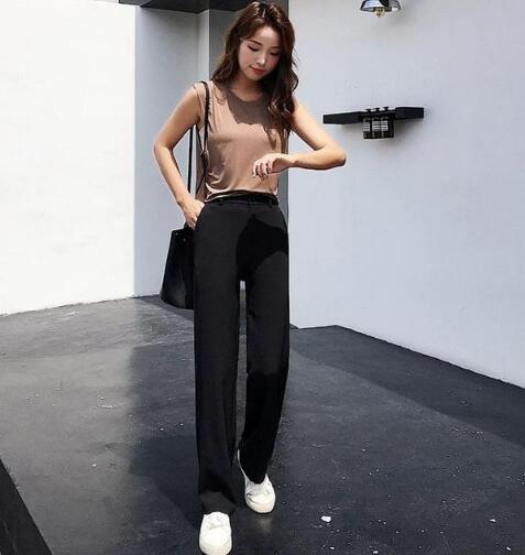 而今时髦达人对西装裤稍作改变就变成了时尚界的新宠。这款裤子是高腰直筒版型,穿上会更修身显瘦。无论你在裤子里面藏多少条秋裤,都可以显示出裤子的飘逸感。面料质感很好,垂感度也是超级棒。整体效果会更偏随性自然一些。而无袖上衣的搭配使我们在夏天不会那么的奇怪,反而多了些妩媚,中和了夏天的闷热。