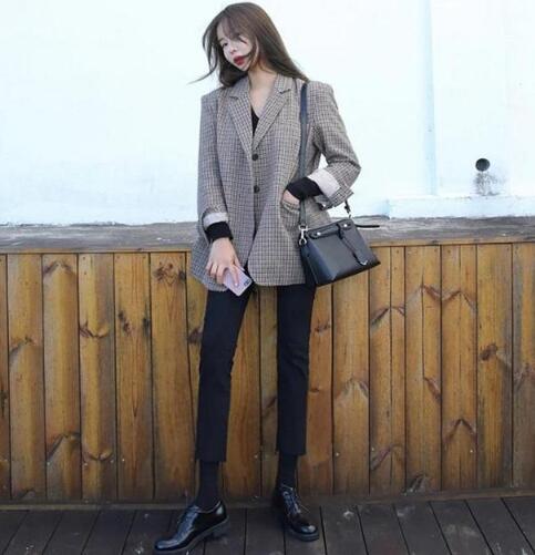 而上半身因为多变的天气的原因,我们最好搭配的是一个外套,格子的外套是我们整体不再有黑色的沉闷感,反而显出了我们的不俗帅气,让我们看起来更加的有活泼气息。这一身搭配让我们更偏向中性的利落气息,所以我们搭配的包包可以多一些女性化,虽然它是黑色的包包,但是他为了迎合我们女人味的效果,包的设计都是链条和小拉链。很好的凸显出了我们想要的女人味。