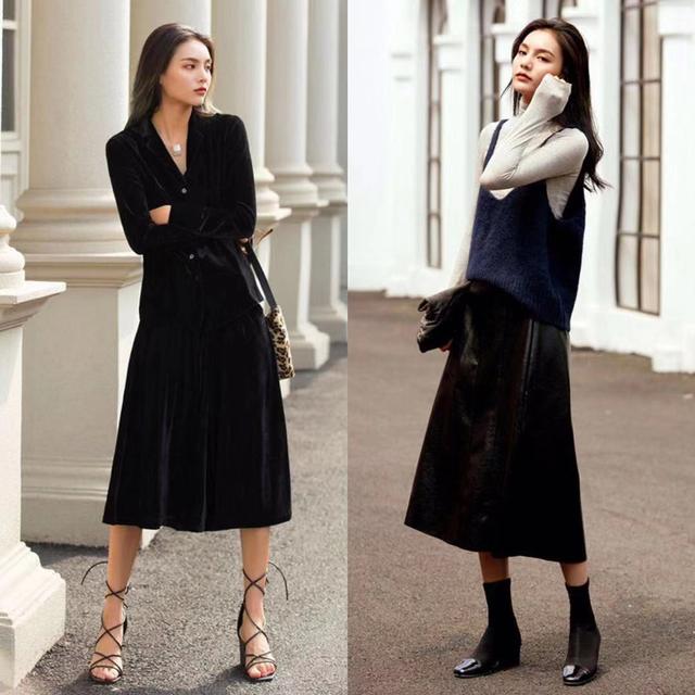 黑色丝绒半身裙,十分的高级显气质。搭配同样黑色丝绒款式的开衫上衣,简单又高级,丝绒质地又是多了几分的优雅,搭配绑带鞋很好的凸显腿部线条,拉高了脚踝的线条,显得腿部修长,性感女人味十足。白色的紧身内搭,外穿一件蓝色丝绒款式的低领背心,背心款式的上衣近几年非常的流行。搭配黑色丝绒半身裙,给人温柔优雅的感觉,简约时尚。