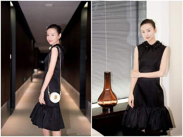 年轻时候的董洁,给人一种清纯可人的形象。而进入30岁以后,她将自己白天鹅的形象,切换成了黑天鹅的形象。这多半是从她服饰的主色调看出来的。比如这一套穿搭,黑色的无袖连衣及膝裙,衣领是增加了蕾丝设计,中间是有收腰的处理,裙下摆是增加了褶皱分层的感觉。再加上董洁将头发挽起来了,整个看起来就非常的具有气质。