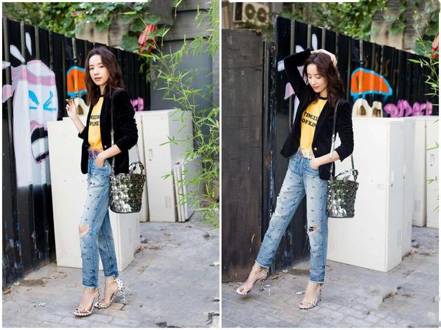 这一套装扮可以看出来是具有多种风格在一起的,首先T恤和牛仔裤的搭配,是有一丝休闲的风格;在外面套了个外套,再加上一头的卷发,又多了一丝霸气的气质在里面。从这样一套搭配来看,虽然董洁整个人的身材是小小瘦瘦的类型,但是却有着爆发力的冲击感。