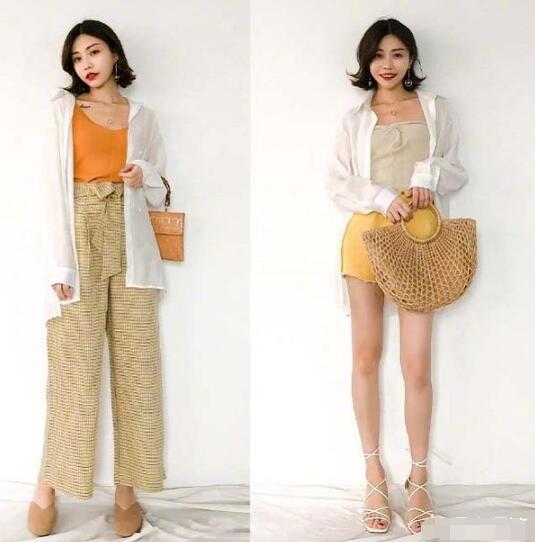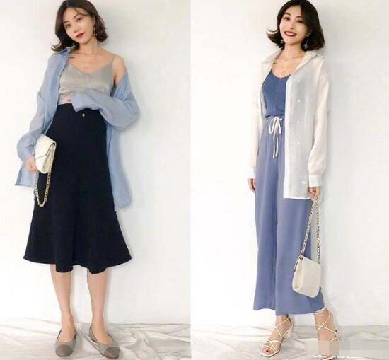 或是白色的防晒外套与阔腿裤套装组合在一起,简洁的白色与洁净的蓝色经典却不过时,而且具有一定的透气性与舒适度,尤为适合夏天,这种长款的穿搭很容易显矮,所以在鞋子方面,尽量一些高跟的设计,利用鞋子的高度来修饰身材!