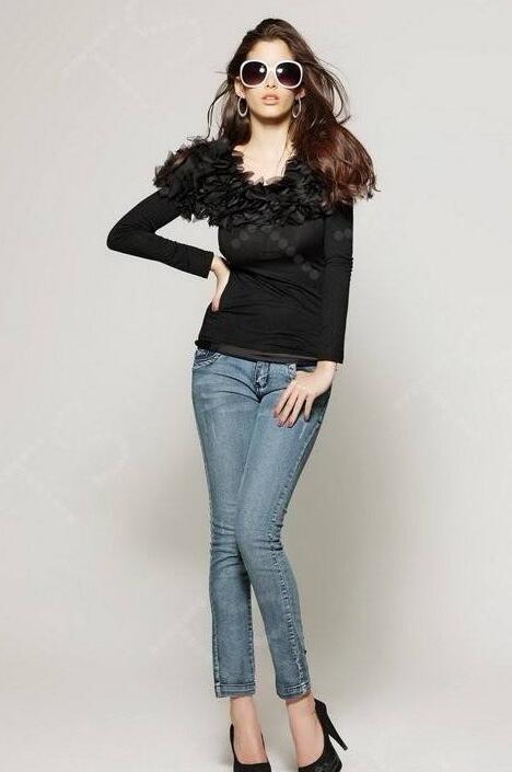 第二,黑色高跟鞋搭配紧身九分裤牛仔裤,和红色的风衣外套。打底衫的话,随意的选择一个纯白色的打底衫就可以了。