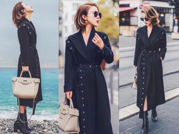 黑色高腰大衣是绑带设计的版型,衣领处还有柳钉的设计,高腰带的版型穿上才能让你变得高挑的身材,超长的版型适合各种身材的女生穿搭,小翻领的设计又是那么的显高级感,排扣的设计个性又有时尚感,搭配黑色短靴,这么搭温暖还很时髦。