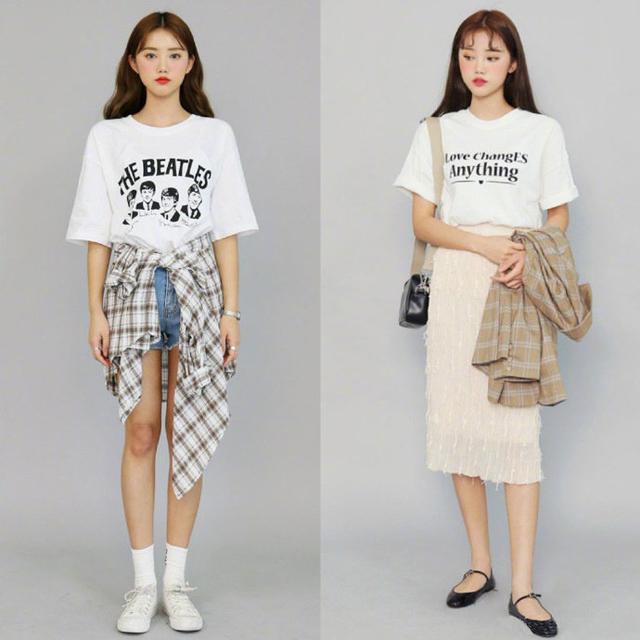 白色T恤是永远不会过时的单品元素,简约纯净,彰显时尚潮流美。胸前的采用精致的印花印字元素,更显活泼可爱,减龄效果更佳。下面搭配牛仔短裤,穿一双白色休闲鞋,一件白色格纹衬衫不羁地系在腰间,彰显青春时尚的运动气息。也可以搭配一条浅粉色半身裙,T恤下摆扎进裤头,更显身材高挑纤细,搭配一双黑色平底鞋,好看又吸睛。