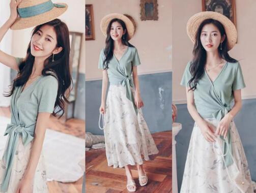 搭配4、这是一件很小清新的绿色T恤,绑带打造出V领包裹衣身的设计,随便穿上都很显身材的,凹凸分明的上半身,让你女人味立显,真心美,而绑带在衣摆的位置系上的蝴蝶结,上身让你气质得到提升,甜美又时尚,下身搭配印花半身裙,很优雅也很时髦,轻松穿出淑女风格。