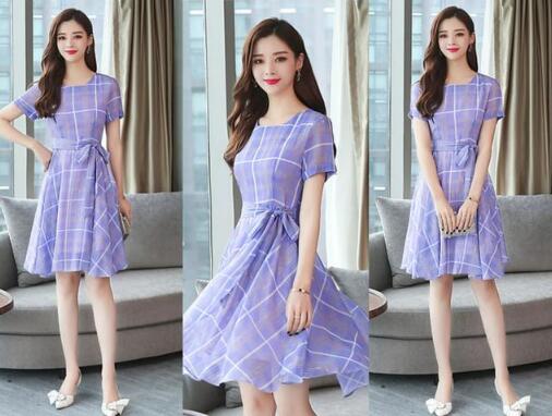 搭配2、很优雅的一款格子连衣裙,淡淡的紫色,知性优雅还特别凸显气质的,领口是方领的设计,衬托出锁骨线条,收腰的设计,轻松勾勒出好看的身材曲线,短裙的款式,无论是什么身材的女生都可以驾驭,A字裙型,穿上就很显瘦显高了,脚踏双平底鞋,鞋面大大的蝴蝶结装饰,夏天这样穿才够时髦。